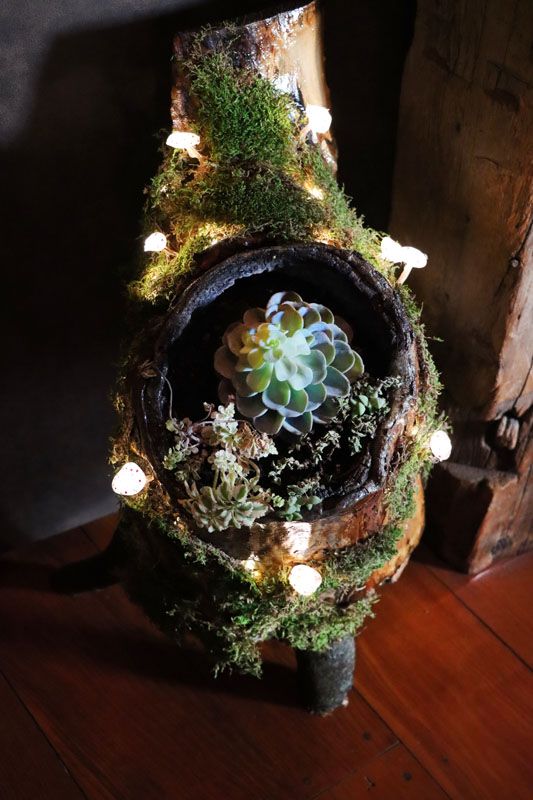 A beautiful woodsy theme stands proudly in the living room area. “Kerry took an old leftover log that we kept holding on to – for, I don’t know – two years maybe, hollowed it out, stripped off the bark, and made room for this succulent terrarium. I just strung the lights to liven it up a bit.” Betsy says. A few of us stand around it, oohing and ahhing over their ingenuity. Under a tree, Betsy’s Mom’s Baked Beans recipe is written out, sewn, and decorated with delicate cross-stitching. So many things we spy seem reverent to family, home, and love.