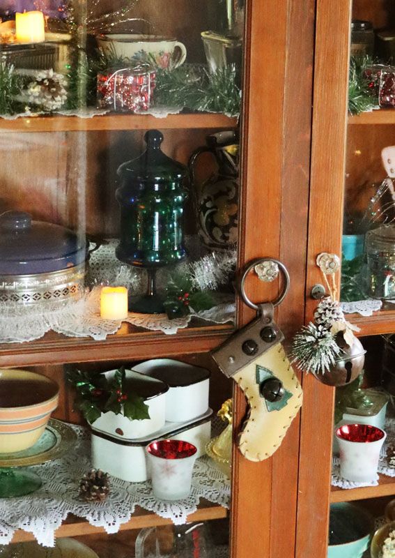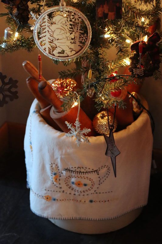 Looking around the happy couple’s property set out in the lush green countryside, a picturesque landscape that must be dotted with vibrant wildflowers and towering oak trees during the warmer months, everything I see appears to have the past attached to it. Handmade ornaments, old-fashioned Santas arranged on the deep shelves of a wood cabinet, a collection of well-used rolling pins set off to one side of a table.